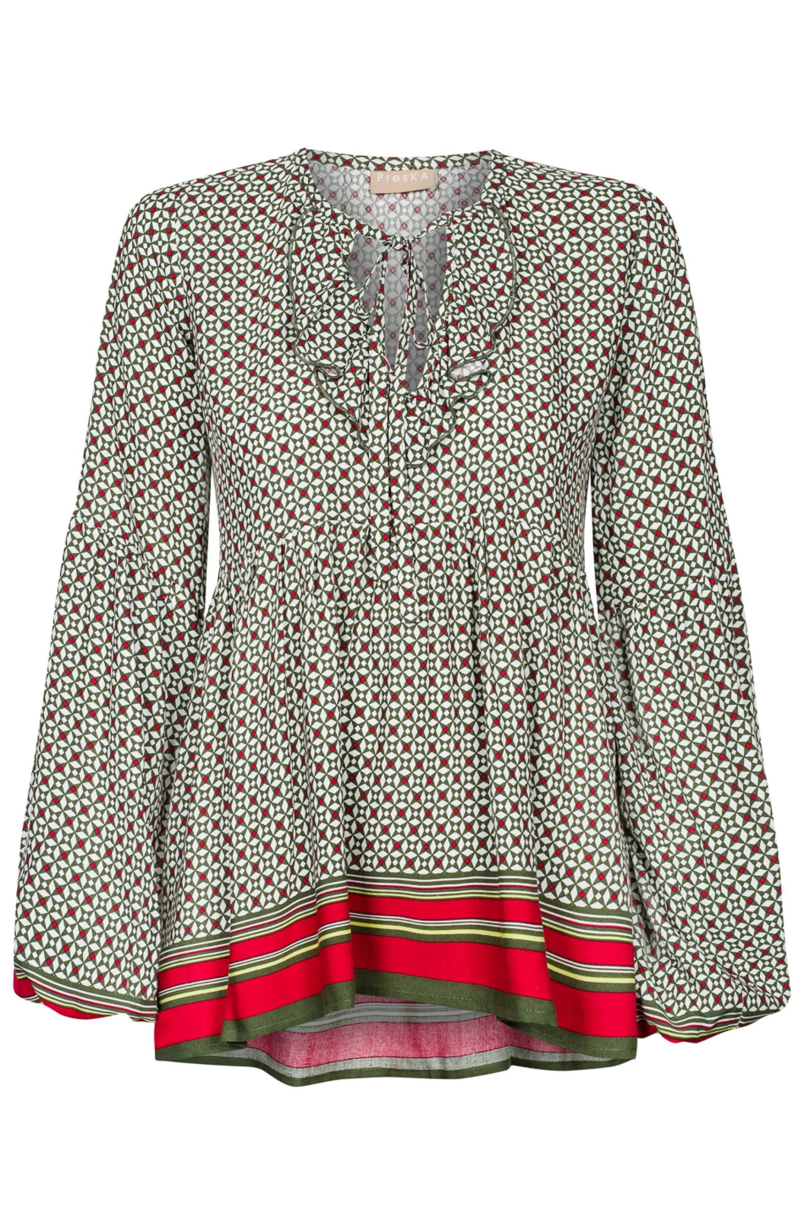 Bluzka wykonana z delikatnej, przewiewnej tkaniny wiskozowej. Wzorzysty print na całej bluzce, dół i rękawy wykończone ożywczą czerwienią. Bluzka z bufiastymi rękawami zakończonymi gumką. Dekolt z pęknięciem oraz ozdobnym żabotem, dodatkowo wiązana trokami. Odcinana pod biustem