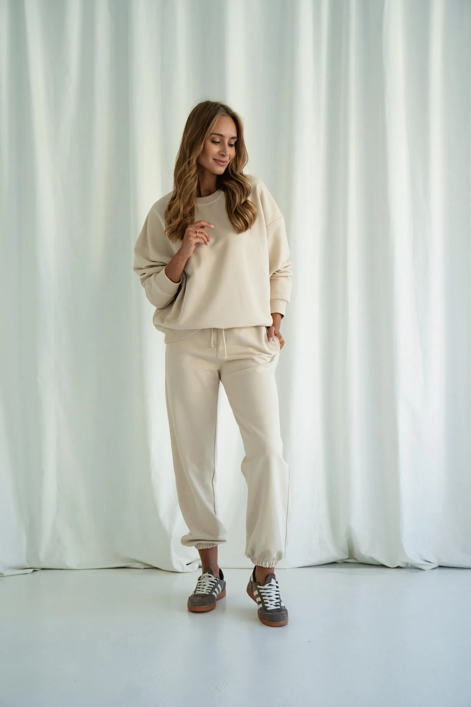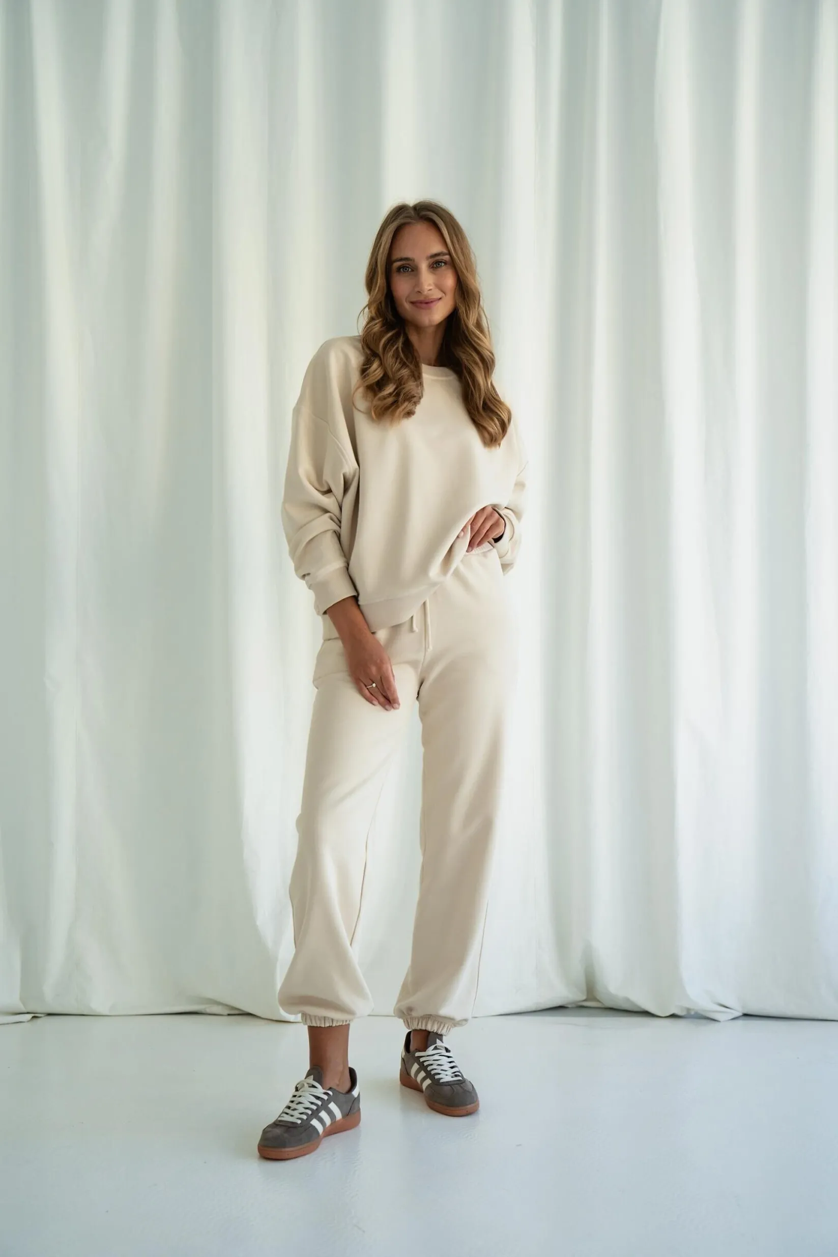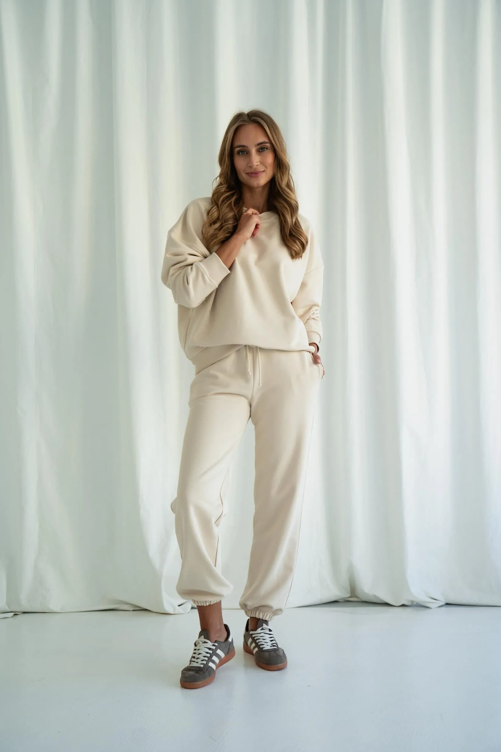 Spodnie MOLI to model z prostą nogawką zakończoną ściągaczem w gumkę. Elastyczny pas w talii z tunelem i sznurkiem. W bocznych szwach kieszenie. Idealany duet tworzy z bluzą ELDA VANILLA oraz longsleevem JEZZ VANIILLA.