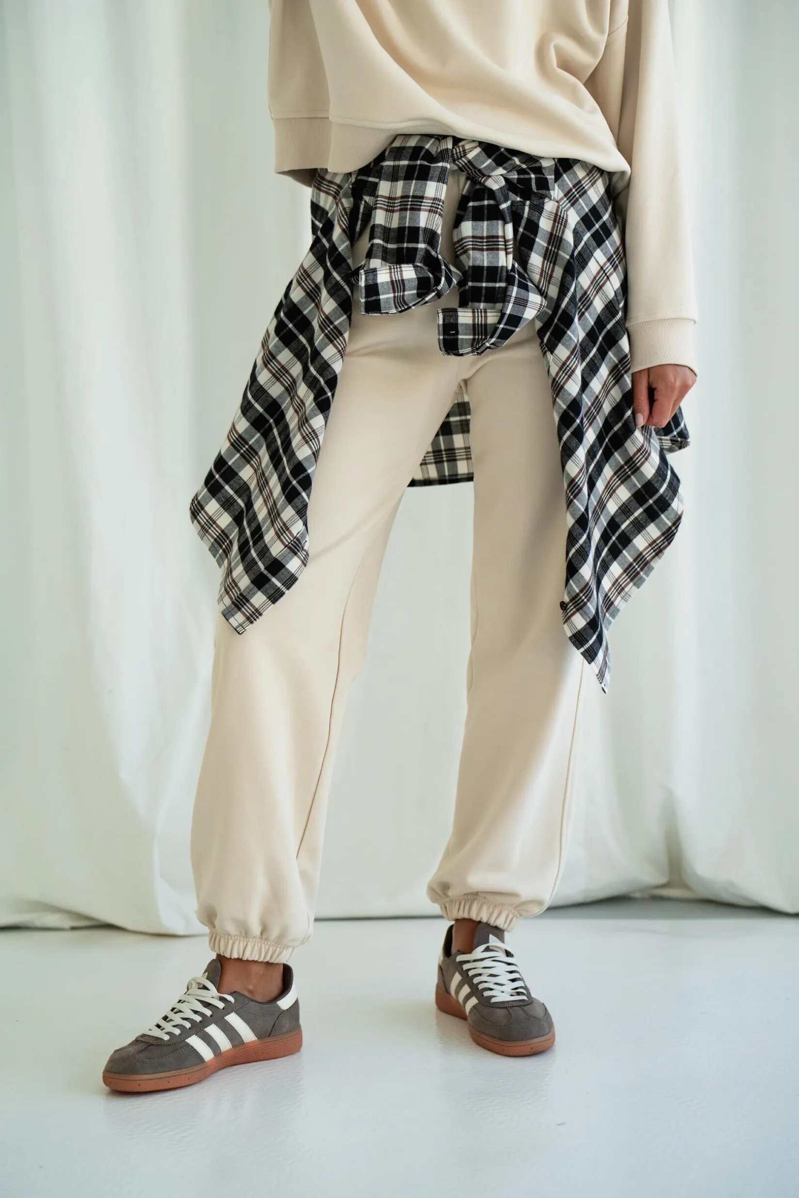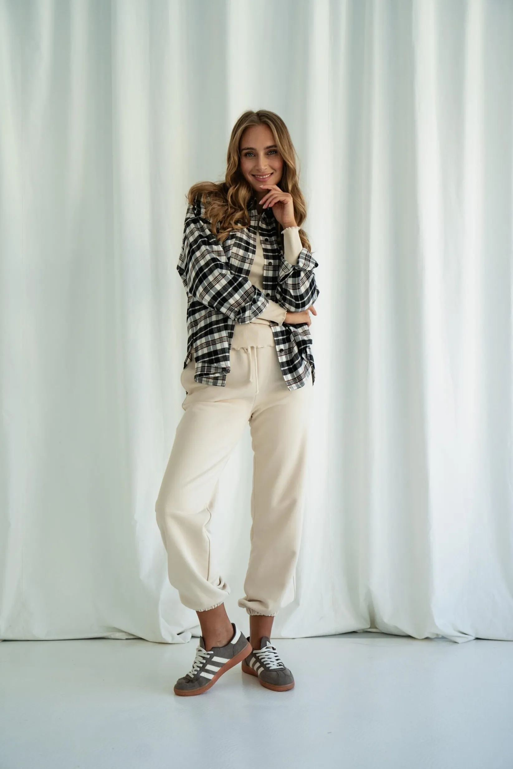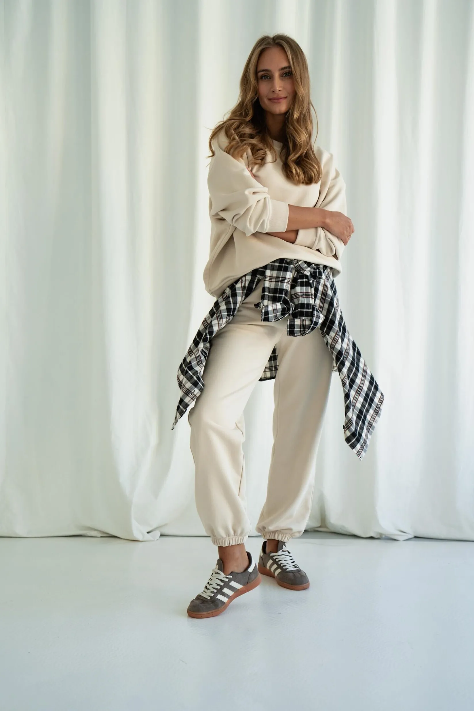 Spodnie MOLI to model z prostą nogawką zakończoną ściągaczem w gumkę. Elastyczny pas w talii z tunelem i sznurkiem. W bocznych szwach kieszenie. Idealany duet tworzy z bluzą ELDA VANILLA oraz longsleevem JEZZ VANIILLA.