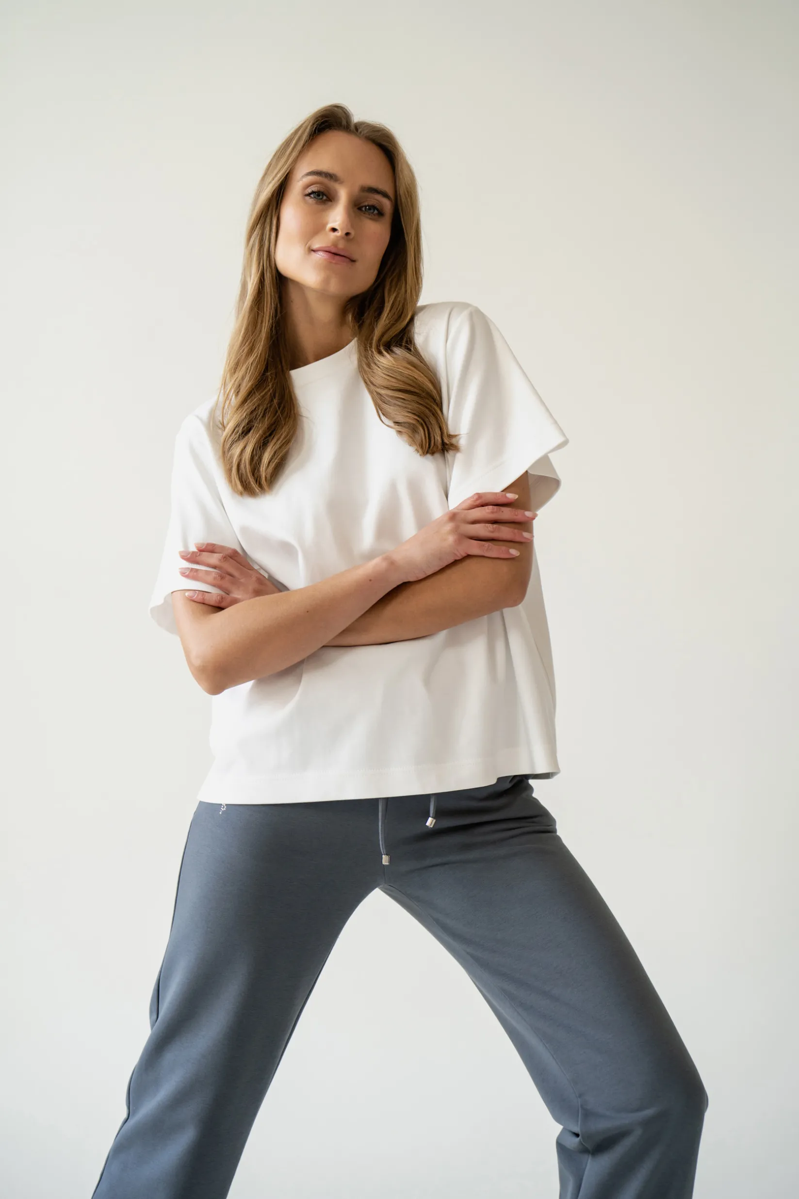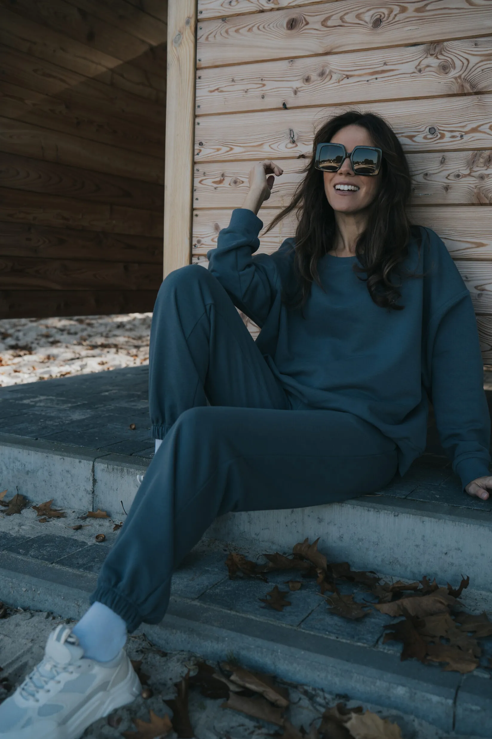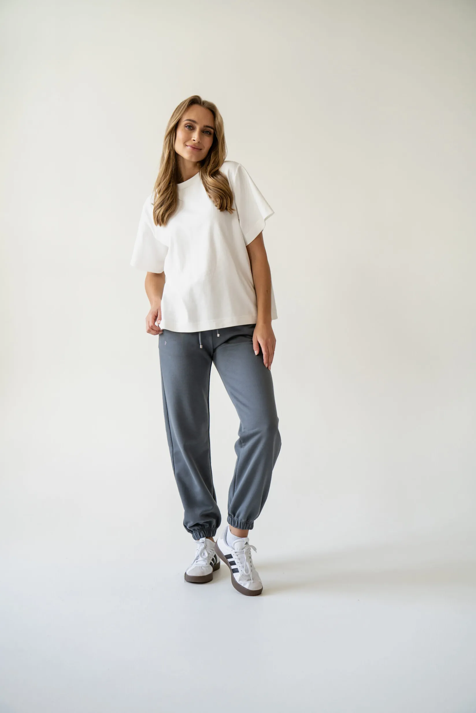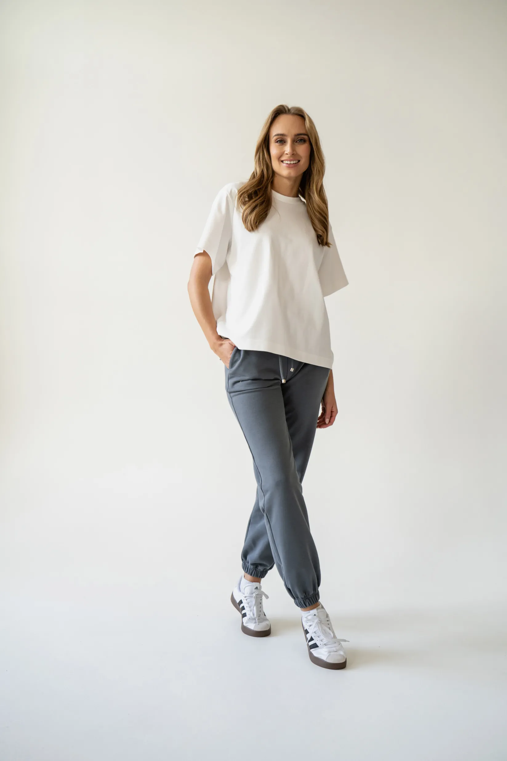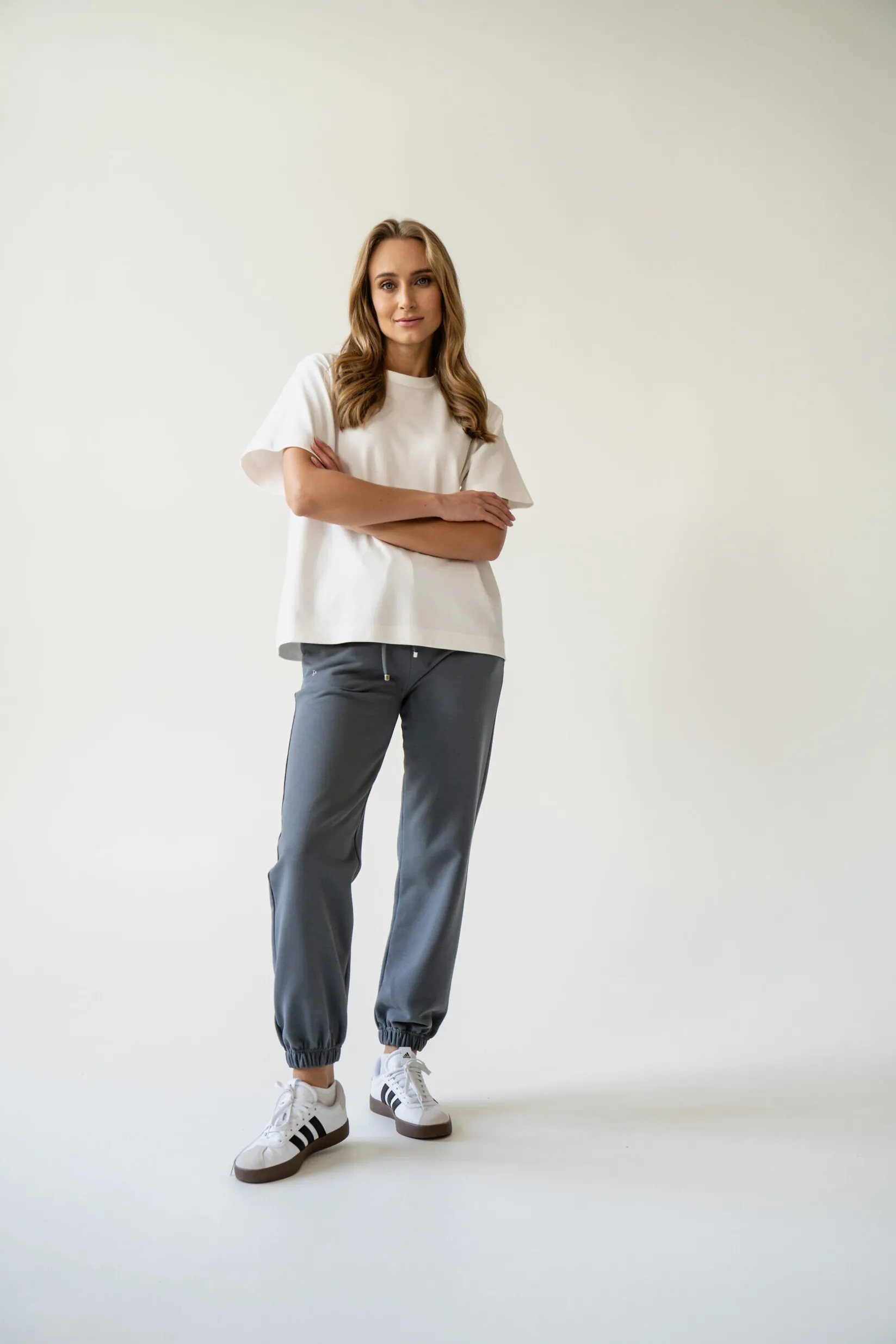 Spodnie – prosta nogawka zakończona ściągaczem w gumkę. Elastyczny pas w talii z tunelem i sznureczkiem. W bocznych szwach kieszenie.