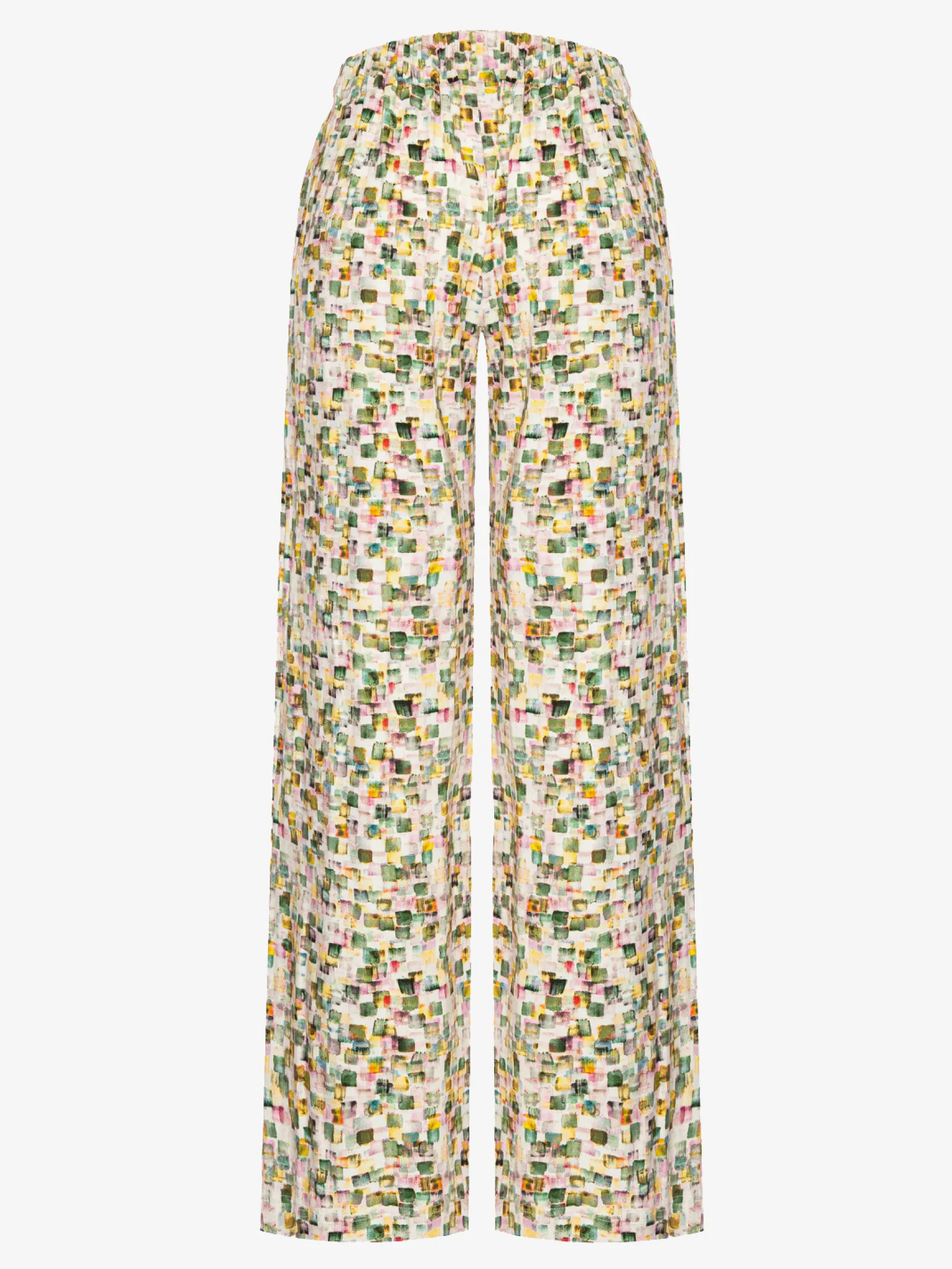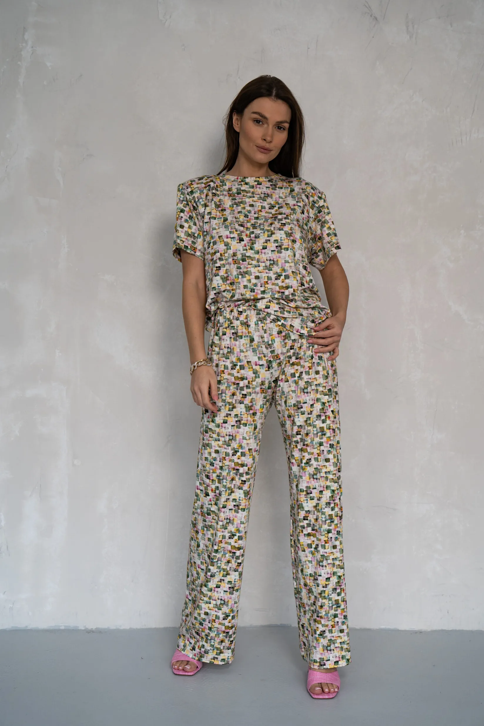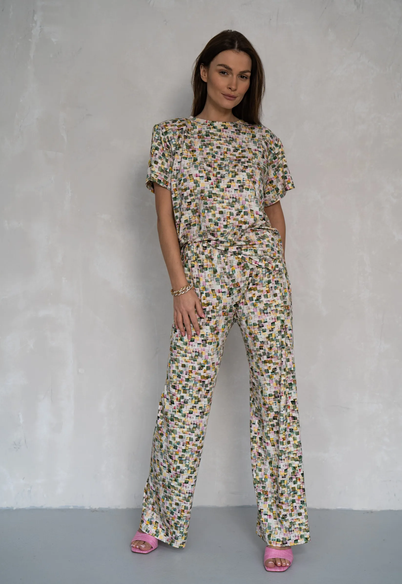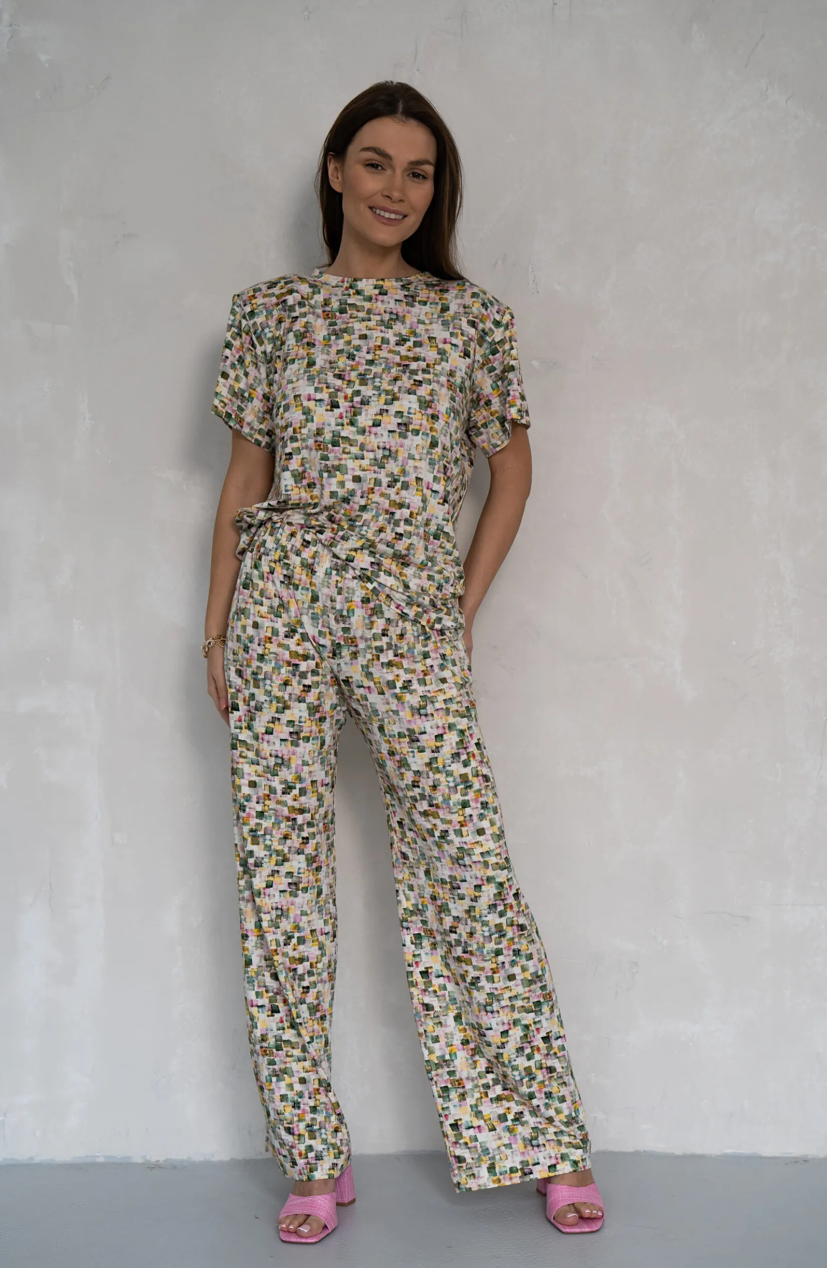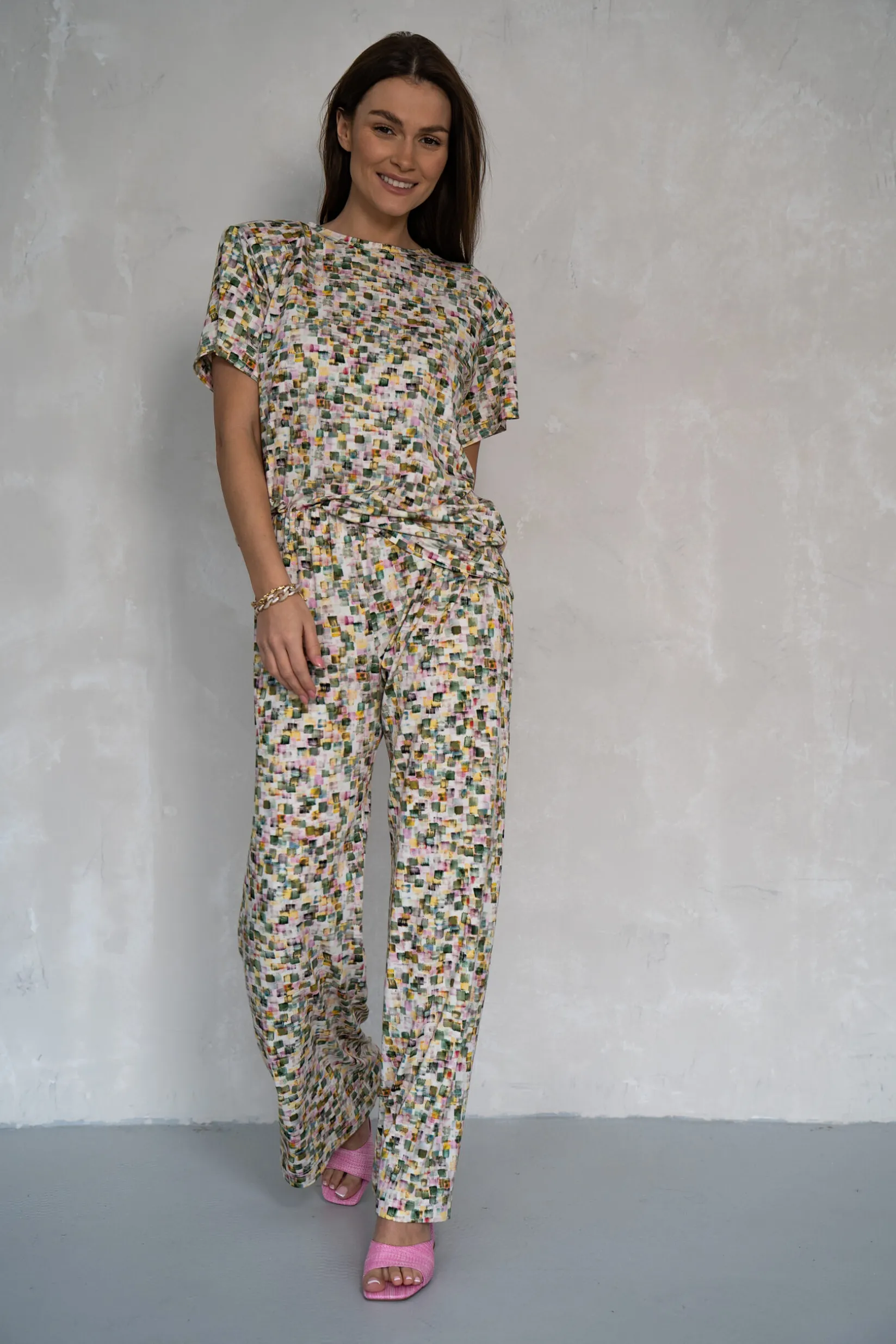 Wykonany z tej samej dzianiny, co bluzka SQUARE. Model o prostej nogawce. W pasie szeroka guma 5ccm. Spodnie nie posiadają kieszeni.