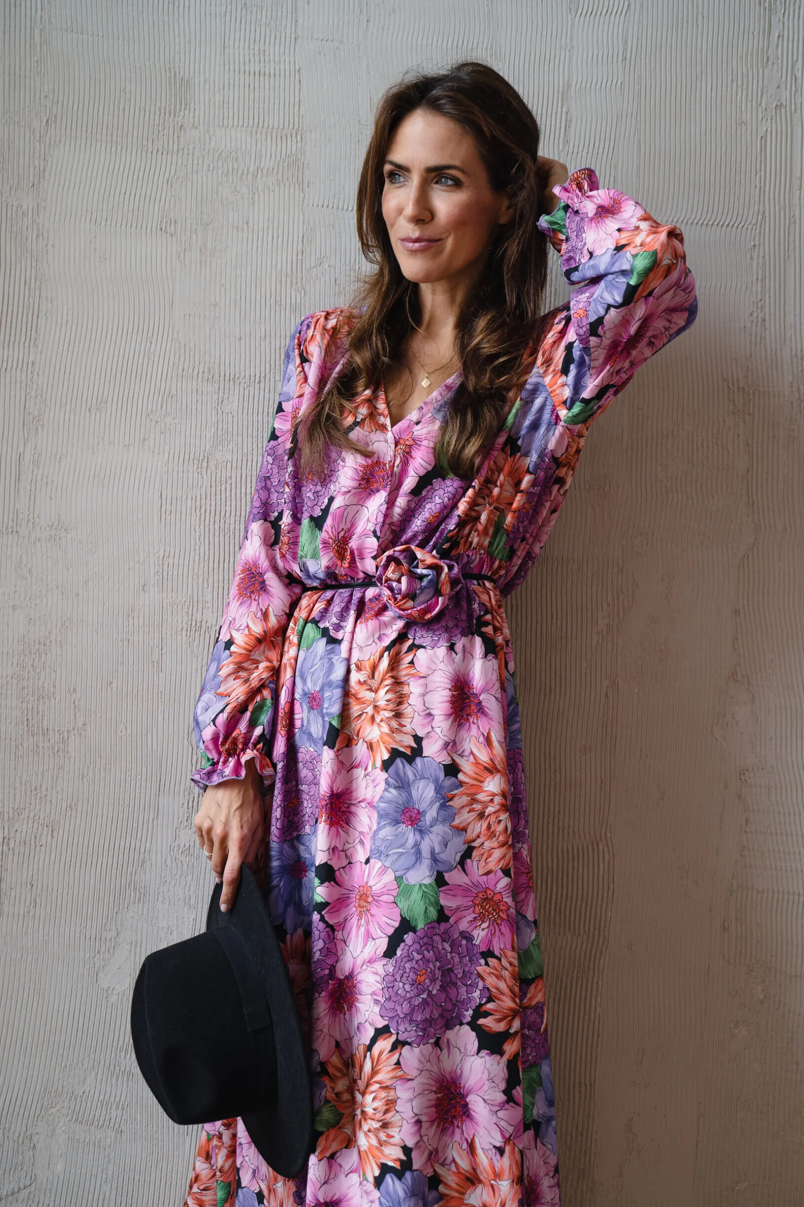 Sukienka w kwiatki – sukienka z kopertowa góra z możliwością zapięcia. Ramiona lekko podniesione przy użyciu poduszki, dodatkowo marszczenia. Rękaw długi zakończony gumeczką, dającą efekt falbanki. Dół sukienki z pół klosza oraz uwodzicielskie pęknięcia po bokach. W pasie delikatna gumka. Dodatkowo pasek z różą z tej samej tkaniny – wykorzystać go można również jako choker. Sukienka zarówno na wielkie wyjścia jak również do codziennych stylizacji.