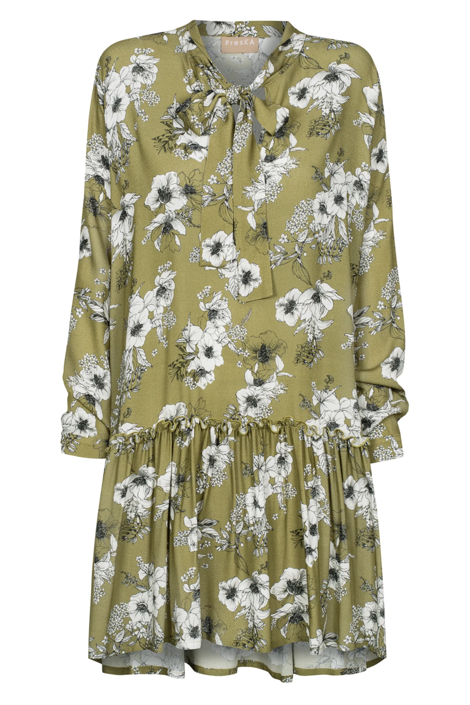 Model sukienki luźny oversizowy. Wykonana z hiszpańskiej wiskozy. Wiązana pod szyją. Ramie wydłużone, rękaw długi zakończony mankietem zapinany na złoty guzik. Na dole frywolna falbana. Sukienkę noś do spodni, ew solo.