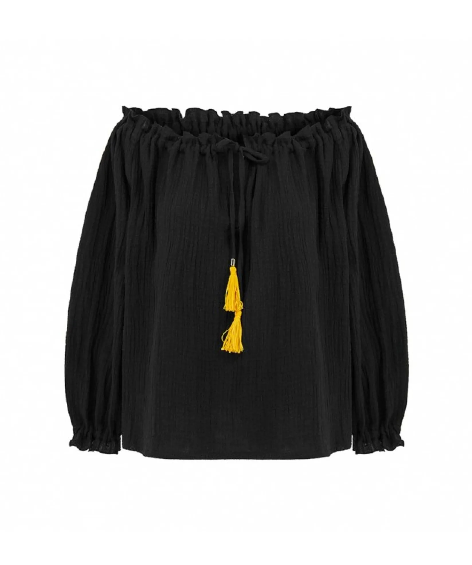 Bluzka wykonana z tkaniny bawełnianej, opuszczana na ramionach z możliwością regulowania. Dekolt z pęknięciem, dodatkowo wiązany, wykończony kontrastowymi chwostami Rękawy zakończone gumka.