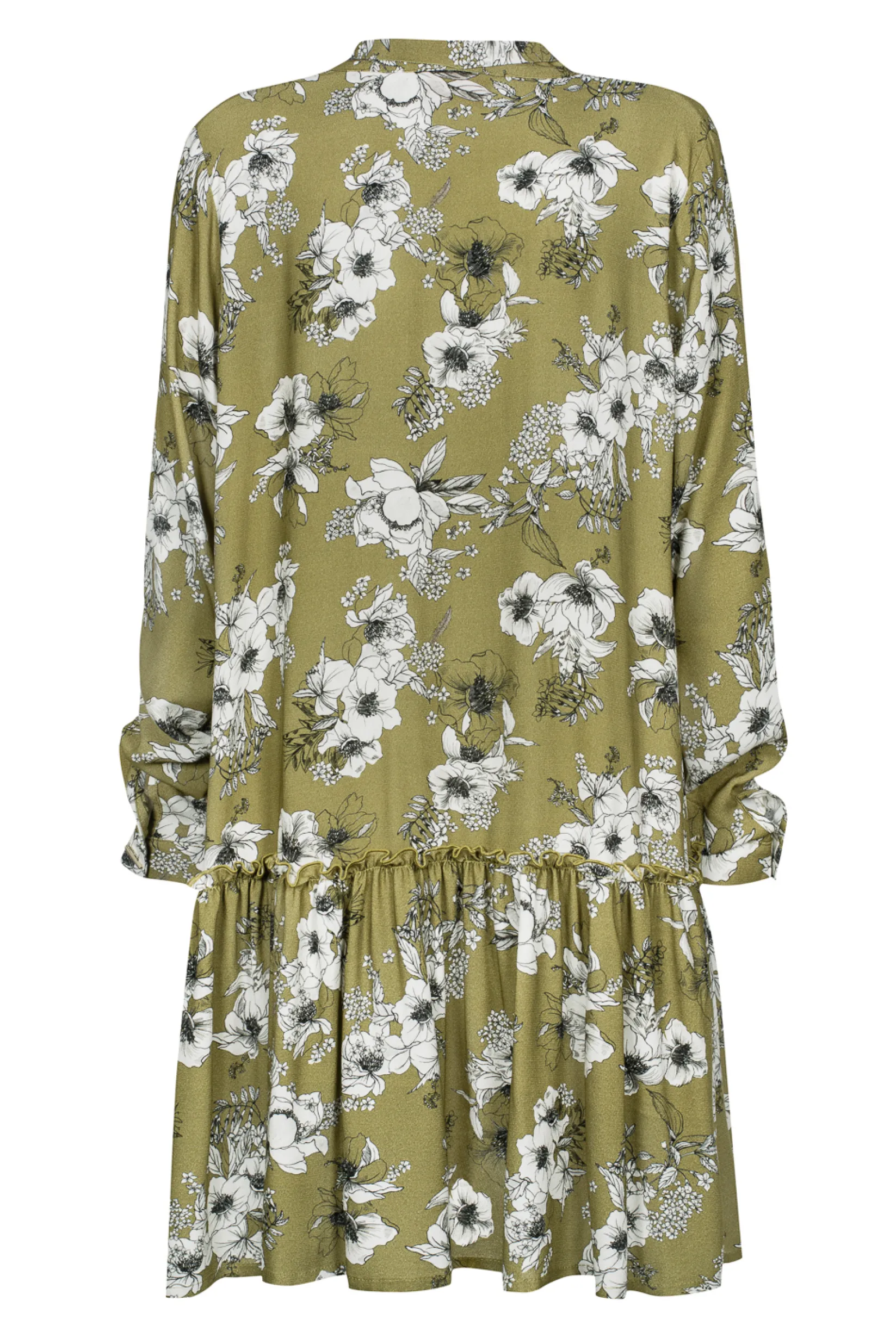 Model sukienki luźny oversizowy. Wykonana z hiszpańskiej wiskozy. Wiązana pod szyją. Ramie wydłużone, rękaw długi zakończony mankietem zapinany na złoty guzik. Na dole frywolna falbana. Sukienkę noś do spodni, ew solo.